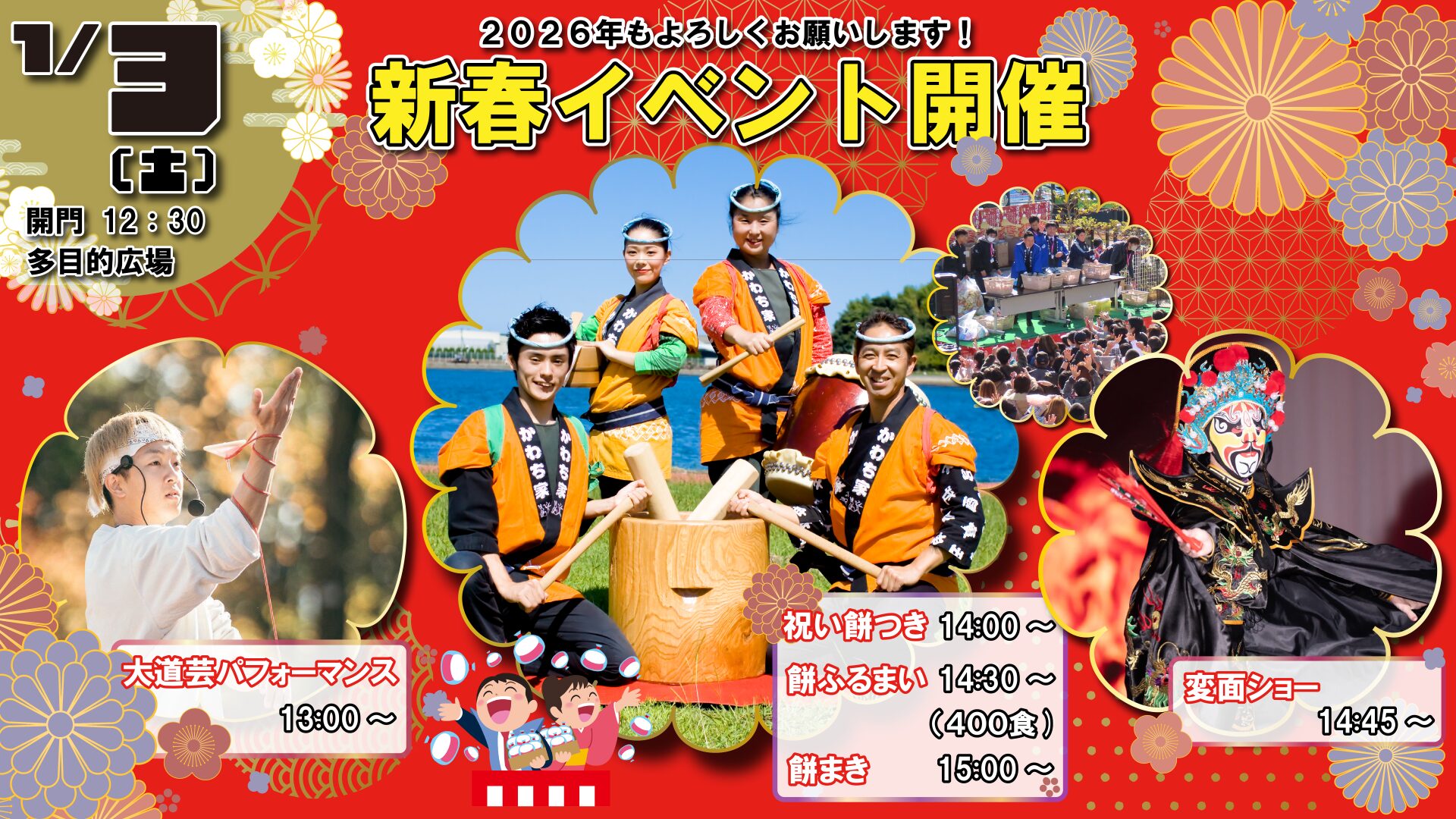 多彩な技の数々の大道芸パフォーマンスから伝統の変面SHOW、そして定番の新春お祝い餅つき!