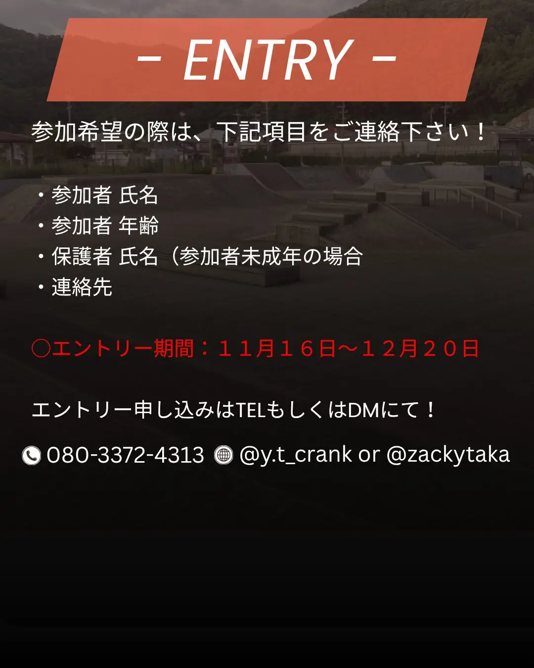お問合せ・申し込みはDMやTELなどから! @y.t_crank or @zackytaka に!